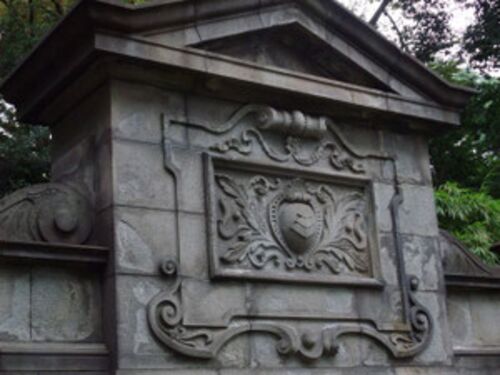 重要文化財の袖塀。今の三菱グループのマークのもとになった岩崎家の家紋である「重ね三階菱」が彫られている。立派です。うーむ、重要文化財か〜、と思ってしまうが、ここまで表現するおうちはもはやないだろう。
