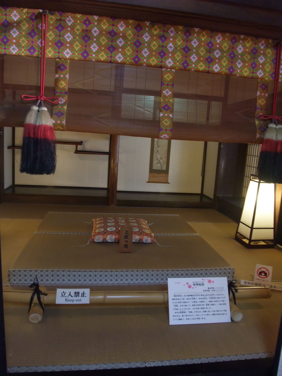 お殿様はこの上段の間に。書院造りになっている。一段分厚い敷物があり、その上にお殿様はお座りになる。床下からの襲撃に備えてのこという説明がされている。あとで気づいたが、撮影禁止のマークがあった。ごめんなさい。気づかなかった。同じような設定だなとばかりにパッと写してしまった。