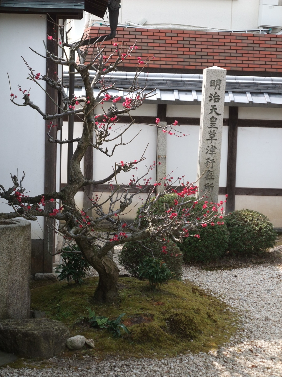 これは明治天皇の行在所の石碑。明治天皇が泊まったという記念碑。本陣は明治3年に廃止されている。明治天皇が泊まったのは明治11年だから、そのあと。天皇は徳川時代なら将軍にあたる。草津にはホテルもなかったであろうから、格式からいって旧本陣に宿泊された。迎える本陣のほうもそれを名誉としたという記念碑である。石碑を建てるほどの大事だったという証であろう。