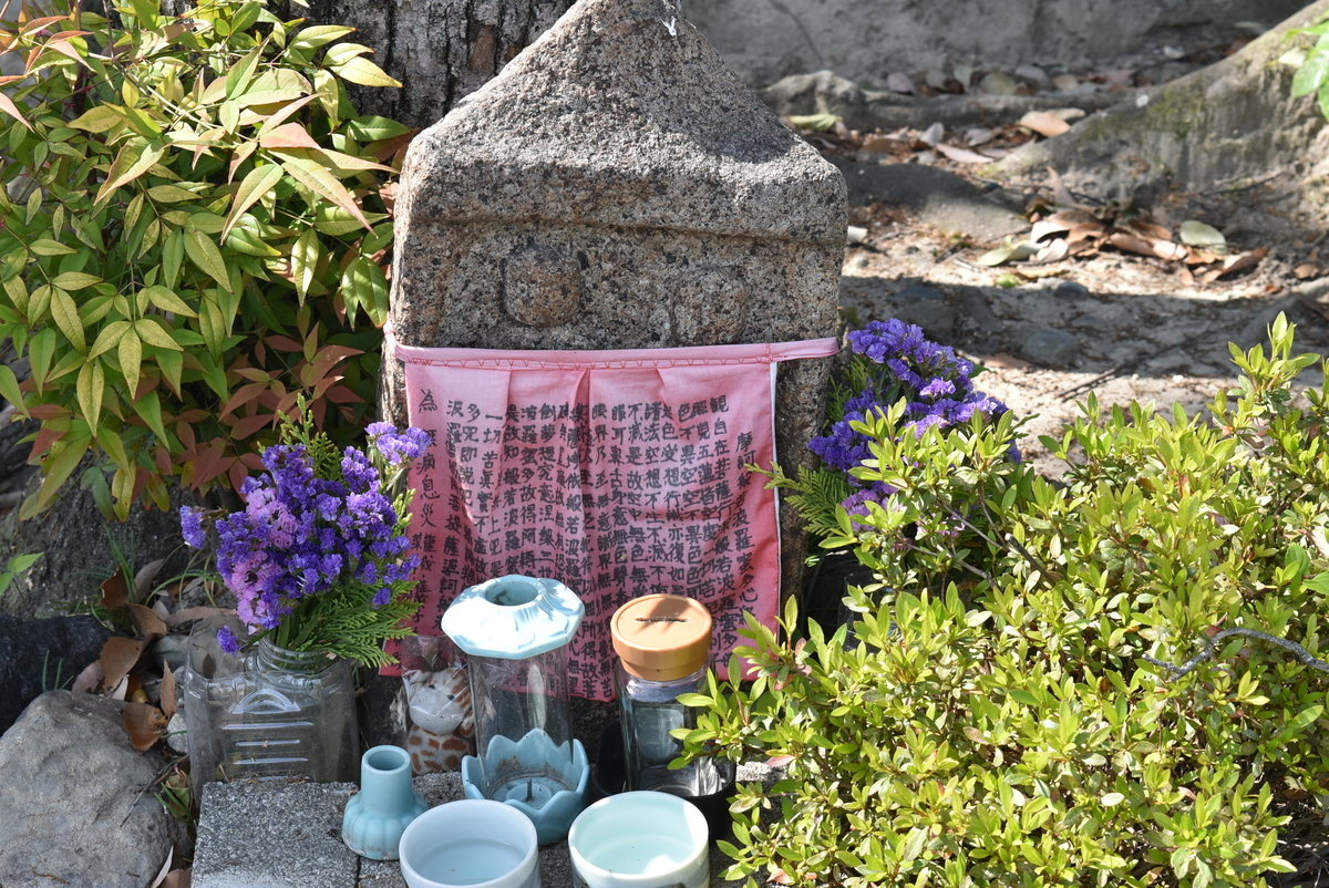 前回のときにも境内の入口にあるこの石をみていたが、赤い布に書かれてある「般若心経」に気をとられ、お地蔵さんか、と思ってしまった。また石像自体もよくわからなかった。その点は今回も同じである。前回はなんで神社で「般若心経?」とそのままスルーしてしまったが、今回は神社に仏教の経典の取り合わせ?ということで写真を撮っておいた。目でみても凹凸などもよく見えず、石像の形などの特徴はよくわからなかった。帰ってきてから写真をみると、頭部のようなものが二つ見えるのに気づいた。これは男女二体の道祖神であろう。お地蔵さまなら頭部はひとつのみ。この石像(=道祖神)がもとからあり、それで道祖神社となったのだと思われる。これに気づくべきだったのだが、赤い前掛けに書かれた「般若心経」のため、ヘンなものとして見過ごしてしまった。花、水が供えてあり、ろうそく立て、線香立てもある。信仰の対象は鳥居の横にあるこの道祖神にあるのだろうということがわかった。道祖神は関東、信州ではそこここで見られる。ここでの信仰の実態はわからないが、この道祖神が大切にされていることはわかる。